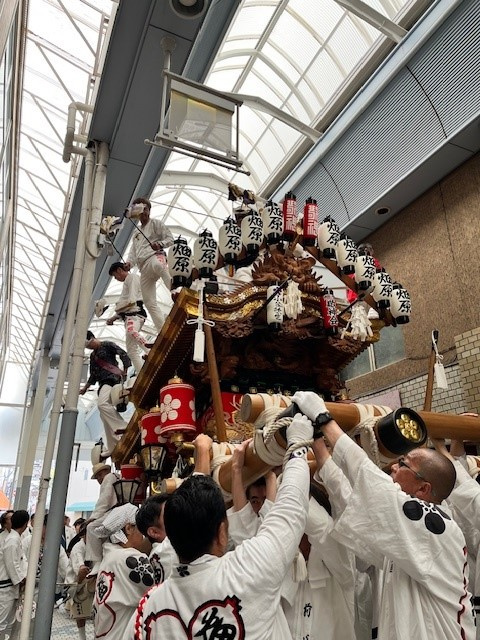 目の前の地車の迫力に圧倒され、商店街のアーケード看板に頭を打たないか心配しつつも